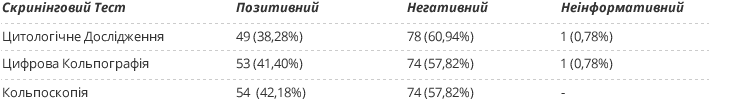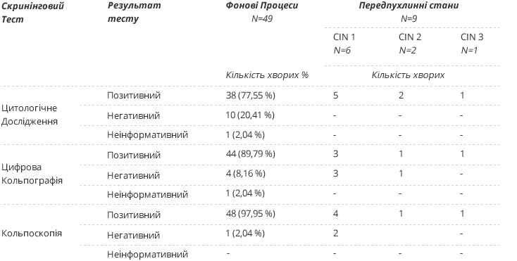 У 58 хворих (45,31%) при подальшому поглибленому клініко-інструментальному та лабораторному обстеженні була виявлена патологія шийки матки. Фонові захворювання виявлені у 49 хворих (38,28%), СIN 1, CIN 2, CIN 3 у 6 (4,69%), 2 (1,56%), 1 (0,78%) хворих відповідно. Структура патологічних змін на шийці матки представлена на діаграмі. У 49 хворих на фонові захворювання позитивний тест при цитологічному дослідженні виявлений у 38 хворих (77,55%), при кольпографії - у 44 (89,79%), при кольпоскопії - у 48 хворих (97,95%) (табл. 3). Із 6 хворих на СIN 1, позитивний тест при цитологічному дослідженні мав місце у 5 хворих, при кольпографії - у 3 хворих, при кольпоскопія - у чотирьох. Таблиця 3 Співвідношення результатів скринінгу з виявленими патологічними станами шийки матки