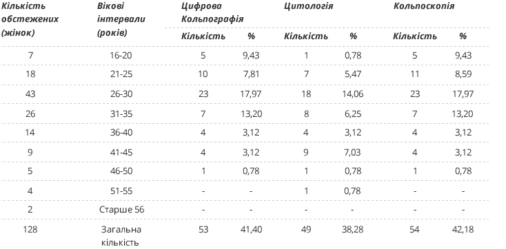 Як видно із таблиці, позитивний скриніговий тест у жінок всіх трьох груп найчастіше діагностувався у віці 26-30 років (табл.2). При вивченні частоти виявлення позитивних скринінгових тестів у різних вікових категоріях установлено, що у віковій групі 16-35 років позитивні візуальні скринінгові тести реєструвались частіше: методом кольпографії у 45 жінок (35,16%), методом кольпоскопії у 46 жінок (35,93%), а цитологічним методом у 34 жінок (26,56%). У віковій групі 41-55 років позитивні скринінгові тести цитологічним методом виявлялись частіше у порівнянні із візуальними методами: цитологічним методом - у 15 жінок (11,72%), візуальний у 9 жінок (7,03%). Таким чином чутливість візуальних скринінгових тестів зменшується з віком, при цьому відмічається збільшення чутливості цитологічного методу, що може пояснюватись анатомічними змінами шийки матки, при яких зона стику циліндричного та плоского епітелію з віком зміщується в цервікальний канал. Таблиця 2 Розподіл пацієнток за віком та результатам позитивних скринінгових тестів