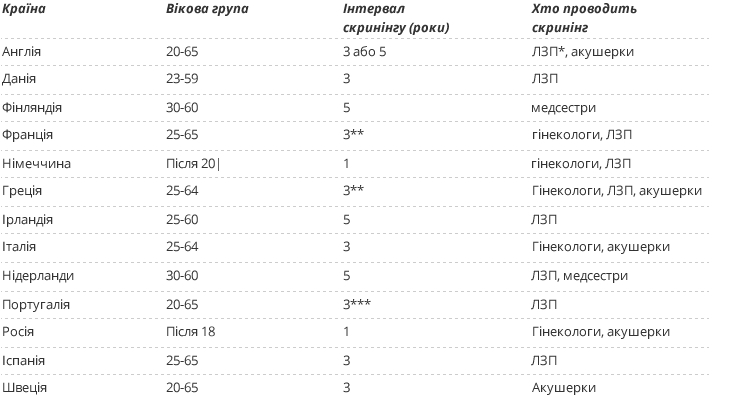 * ЛЗП (лікарі загальної практики) ** через 1 рік, після 2 негативних результатів, кожні 3 роки *** через 1 рік, після 1 негативного результату, кожні 3 роки Між цими програмами є як схожість, так і відмінність. По рівню організації - в Фінляндії, Англії, Германії, Люксембурзі, Нідерландах, Швеції - це національні програми. По рокам впровадження – 1960 рік - Швеція, 1963 рік - Фінляндія, 2000 рік - Ірландія. Інтервали скринінгових обстежень в різних країнах від 1-го до 5 років. Наприклад в Австрії, Германії - це 1 рік, Англії, Фінляндії, Нідерландах - 5 років, в Бельгії, Данії, Швеції - 3 роки. Віковий діапазон жінок, які підлягають скринінгу, в більшості країн від 20-25 років до 60 років. Скринінг проводиться, як лікарями гінекологами, так і лікарями загальної практики, медсестрами, акушерками. Більшість програм має державне фінансування [11,12,13,14,15]. Сьогодні основні зусилля європейських країн спрямовані на поліпшення нині діючих програм, трансформація регіональних програм в національні, встановлення єдиних критеріїв якості та пошук нових методологій. Так, в Швеції впроваджено пілотний проект виявлення вірусу папіломи людини , як методу скринінгу. Результатом 30 річного впровадження цитологічного скринінгу в Фінляндії, стало зменшення захворюваності на рак шийки матки з 15 до 2,8 на 100 000 жіночого населення, а смертності з 7 до 0,8 на 100 000 жіночого населення. Слід підкреслити, що однією з основних скринінгових процедур програми скринінгу на РШМ, залишаються цитологічні дослідження мазків з шийки матки. Однак цитологічні дослідження мазків з шийки матки залишаються однією з основних скринінгових процедур програми скринінгу на РШМ. Цитологічний скринінг раку шийки матки принципово відрізняється від інших видів скринінгу. Будучи по суті діагностичним тестом, він не направлений на діагностику клінічних форм РШМ. Основна мета цитологічного скринінгу полягає в виявленні передпухлинної патології та доклінічних стадій раку шийки матки, своєчасному їх лікуванню та профілактиці РШМ. Критерієм ефективності цитологічного скринінгу раку шийки матки служить зниження захворюваності і смертності від раку даної локалізації [3,10]. Цитологічний скринінг не може виключати вплив етіологічних факторів виникнення РШМ, він тільки перериває патологічний ланцюг передрак-рак. Тому навіть в тих розвинутих країнах, де програми скринінгу дозволили суттєво знизити захворюваність і смертність від РШМ, продовжується інвестування в ці програми [4,7,8]. Призупинення або скорочення програми скринінгу призводить до реалізації патологічного ланцюга передрак-рак, і як результат зростання захворюваності РШМ і повернення її до рівня, який передує впровадженню програми скринінгу РШМ [5]. Сьогодні в Україні створена розгалужена мережа цитологічічних лабораторій. В 2002 р. по даним МОЗ України в Україні функціонує 58 централізованих цитологічних лабораторій. В 1976 р. їх нараховувалось – 3, в 1979 р. – 28, 1987 р. – 57, 1997 р.- 66, 1999 р. – 63, в яких виконано 19 053 433 цитологічних досліджень (в 1979 р. – близько 4 млн.). Проте охоплення жіночого населення України програмами скринінгу РШМ сьогодні не перевищує 30%. Якщо врахувати, що цитологічний скринінг згідно рекомендацій ВОЗ проводиться 1 раз в 3 роки, то кількість цитологічних досліджень при профілактичних гінекологічних оглядах жінок, які виконуються в Україні, зн