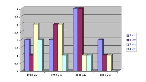 Всі ці огляди нерідко дублюють один одного і тому дані про 100% охоплення профоглядами жінок, які наводяться в формах звітності ЛПЗ не відповідає дійсності. Застосування інформаційної системи дало низку переваг: По перше - проведення аналізу по групам ризику, та виділення жінок, які не проходили скринінг 2 та більше років, дало змогу активно планувати періодичність скринінгу та проводити селективний скринінг. По друге - введення коду медичного працівника дозволило аналізувати якість роботи по кожній дільниці чи ФАП. По-третє - застосування інформаційної системи дало змогу прослідкувати на якому етапі своєчасно не діагностовано онкологічне захворювання. Аналіз показав, що участь в програмі скринінгу серед неорганізованого 52,9%. Охват скринінгом жінок після 45 років постійно зменшується з віком, в той час, як показники захворюваності в цих групах навпаки зростають. Завдяки застосуванню інформаційних технологій були сплановані заходи направлені на збільшення охоплення скринінгом жінок з групи ризику. Крім того, проведення інструктажу та застосування спеціальних щіток для забору матеріалу на цитологічне дослідження, зменшило відсоток неінформативних досліджень з 3,5% до 1,8%. За перші 2 роки роботи програми, як і слід було очікувати, відмічали ріст кількості зареєстрованих випадків РШМ, за рахунок збільшення участі населення в програмі. В перший рік роботи програми збільшення за рахунок діагностики 2-ої та 3-ої стадії, другий рік роботи за рахунок 1-ої та 2-ої, а вже на 3-й рік роботи програми зменшення кількості зареєстрованих випадків РШМ. Розподіл хворих на рак шийки матки виявлених під час скринінгу, в залежності від стадії захворювання представлений в діаграмі 2. Діаграма 2 Розподіл хворих на рак шийки матки виявлених під час скрінінгу, в залежності від стадії захворювання